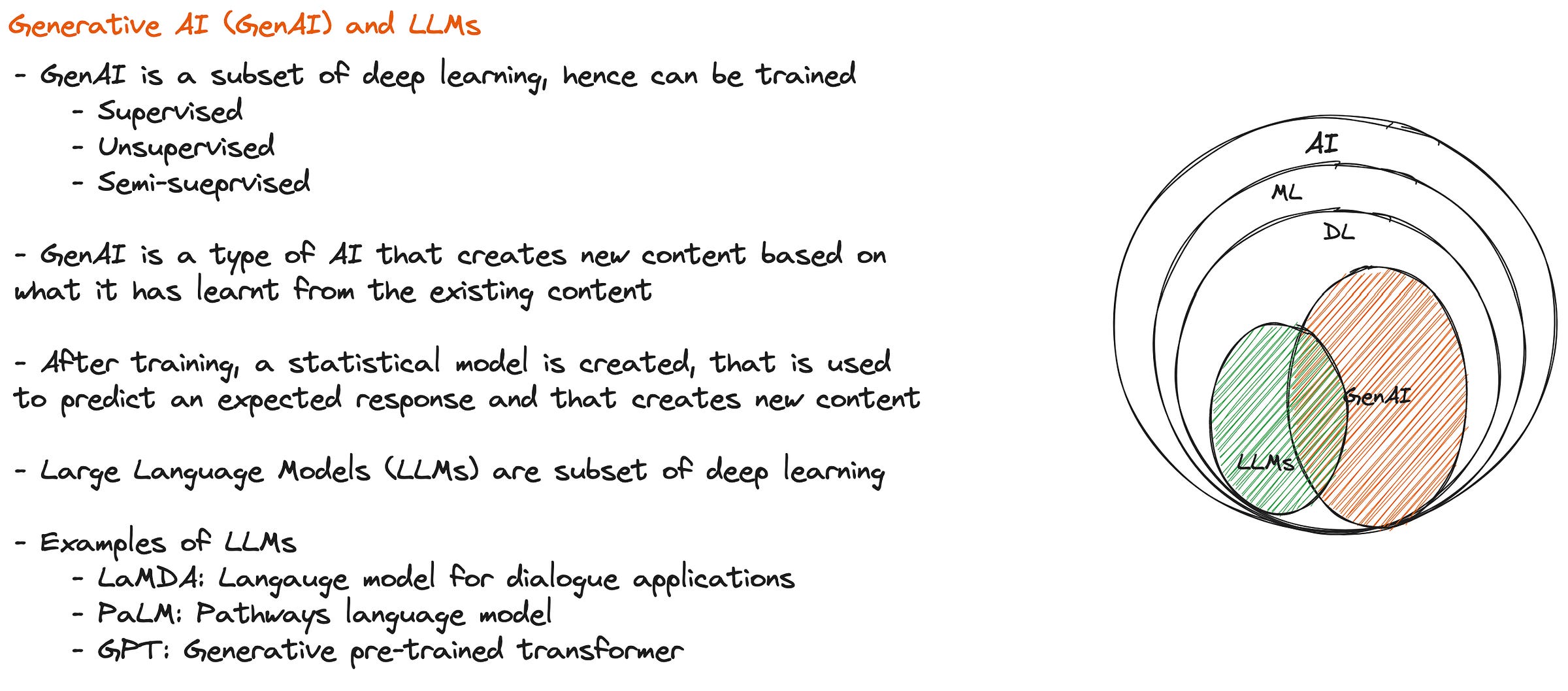 Generative AI and Large Language Models (LLMs) both fall under the umbrella of deep learning, and their domains significantly intersect, as illustrated in the figure below. These cutting-edge technologies harness massive datasets to decipher patterns and representations within the data. Generative AI models, exemplified by the likes of Generative Adversarial Networks (GANs), and massive language models like the renowned GPT-3, undergo rigorous training on extremely large datasets to capture and produce meaningful information.