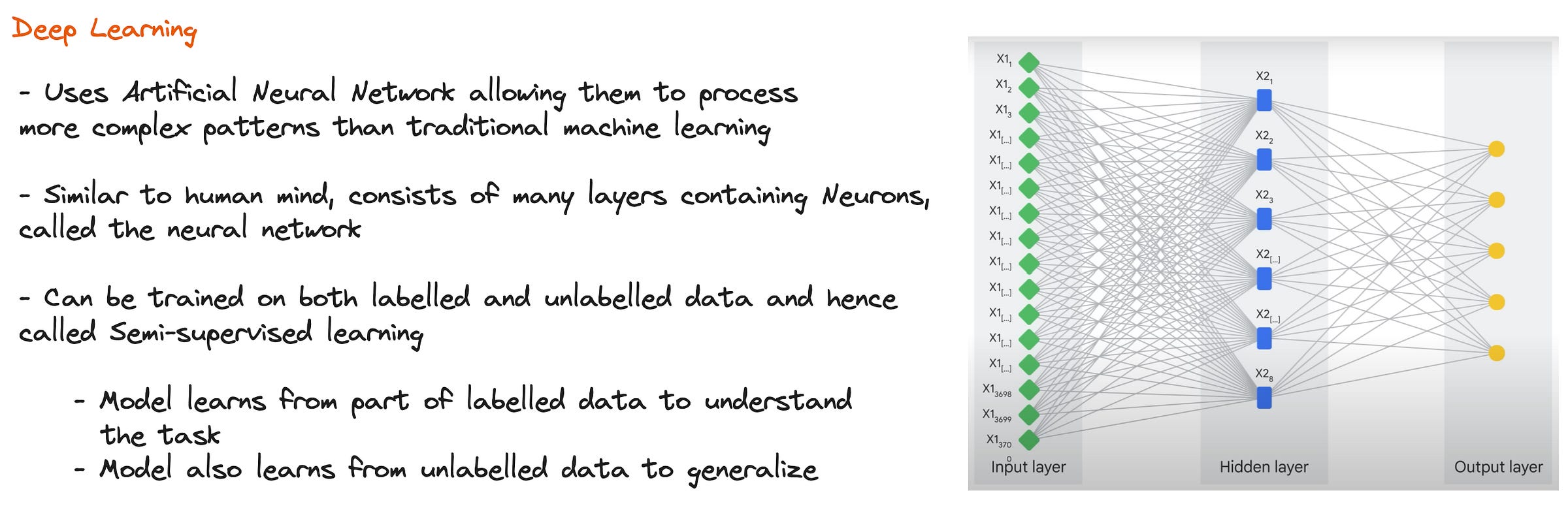 Deep Learning (DL) is a subfield of ML that focuses on neural networks with multiple layers (deep neural networks) to automatically learn and represent data for more complex tasks. DL has revolutionized areas like computer vision and natural language processing, enabling breakthroughs in image recognition, language translation, and speech recognition.